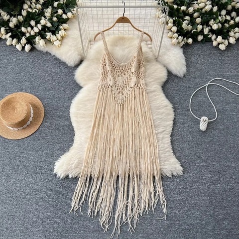 Elegante Chic Vestido de Verão Vintage para Mulheres High Street Beach Vacation Slim Correias Borla Flor Gancho Padrão Sólido Knit Draped