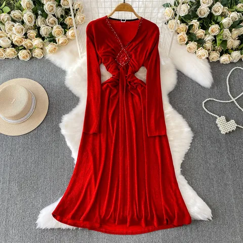 Vestido de festa chique Vintage noite para mulheres Sexy Slim Hotsweet Midi comprimento Decorado drapped strass cerimônia sólida das mulheres
