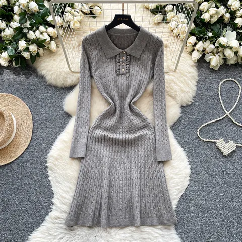 Chic Vintage Mulheres Vestido A-Line Sexy Knit Turn-Down Collar Plissado com Decoração Draped Lavável Praia Casual Vestuário